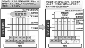 隨著城市人口的聚集,產(chǎn)業(yè)的升級發(fā)展,人們對生活質(zhì)量期望的提升,城市各行業(yè)領(lǐng)域都迫切地需求借助信息化手段提升社會管理效率和公共服務(wù)的能力。信息 城市階段,城市各行業(yè)領(lǐng)域建立各自的信息化系統(tǒng),各行業(yè)信息化系統(tǒng)彼此獨(dú)立,信息資源沒有進(jìn)行有效的匯聚整合和共享。智慧城市階段就是通過增加跨行業(yè)領(lǐng)域 的運(yùn)營中心,匯集整個城市運(yùn)營層面的數(shù)據(jù),將原有的行業(yè)信息化延展為社會信息化,并將社會管理納入統(tǒng)一系統(tǒng),為分析各行業(yè)領(lǐng)域相關(guān)性,實(shí)現(xiàn)智慧決策創(chuàng)造了 條件。智慧城市相對信息城市來講,加強(qiáng)了各行業(yè)系統(tǒng)及數(shù)據(jù)之間的相關(guān)性,通過關(guān)聯(lián)關(guān)系挖掘新的價值,不再單純追求因果關(guān)系的分析。