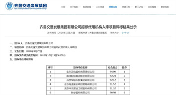 2016年10月19日,齊魯交通發(fā)展集團有限公司招標代理機構(gòu)入庫項目進行公開開標,我公司以綜合得分第一的成績成功入圍。