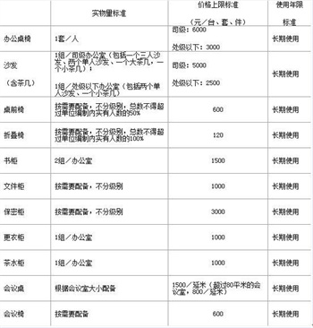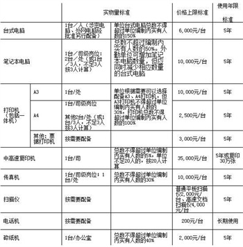第三條 中央行政單位通用辦公設(shè)備家具購(gòu)置費(fèi)預(yù)算標(biāo)準(zhǔn)包括實(shí)物量標(biāo)準(zhǔn)、價(jià)格上限標(biāo)準(zhǔn)以及使用年限標(biāo)準(zhǔn)三部分。